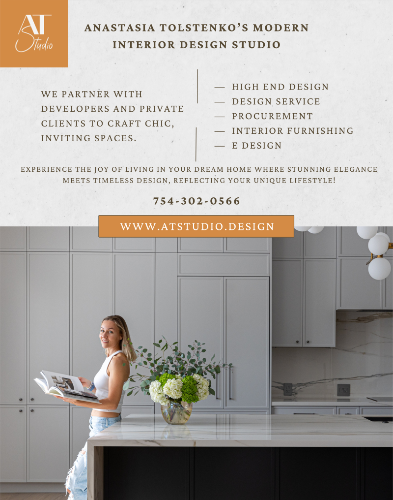 Anastasia Tolstenko’s modern interior design studio, located in Parkland, South Florida, works closely with real estate developers and private clients to create stylish and inviting spaces that reflect their unique personalities and tastes.
