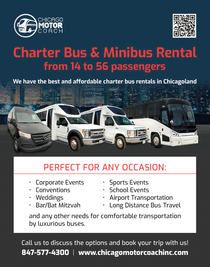 Chicago Motor Coach offers Charter Bus & Minibus Rental – from 14 to 56 passengers. We have the best and affordable charter bus rentals in Chicagoland, perfect for any occasion: Corporate Events, Conventions, Weddings, Bar/Bat Mitzah, Sports events, School Events, Airport Transportation, Long Distance Bus Travels and any other needs for comfortable transportation by luxurious buses.